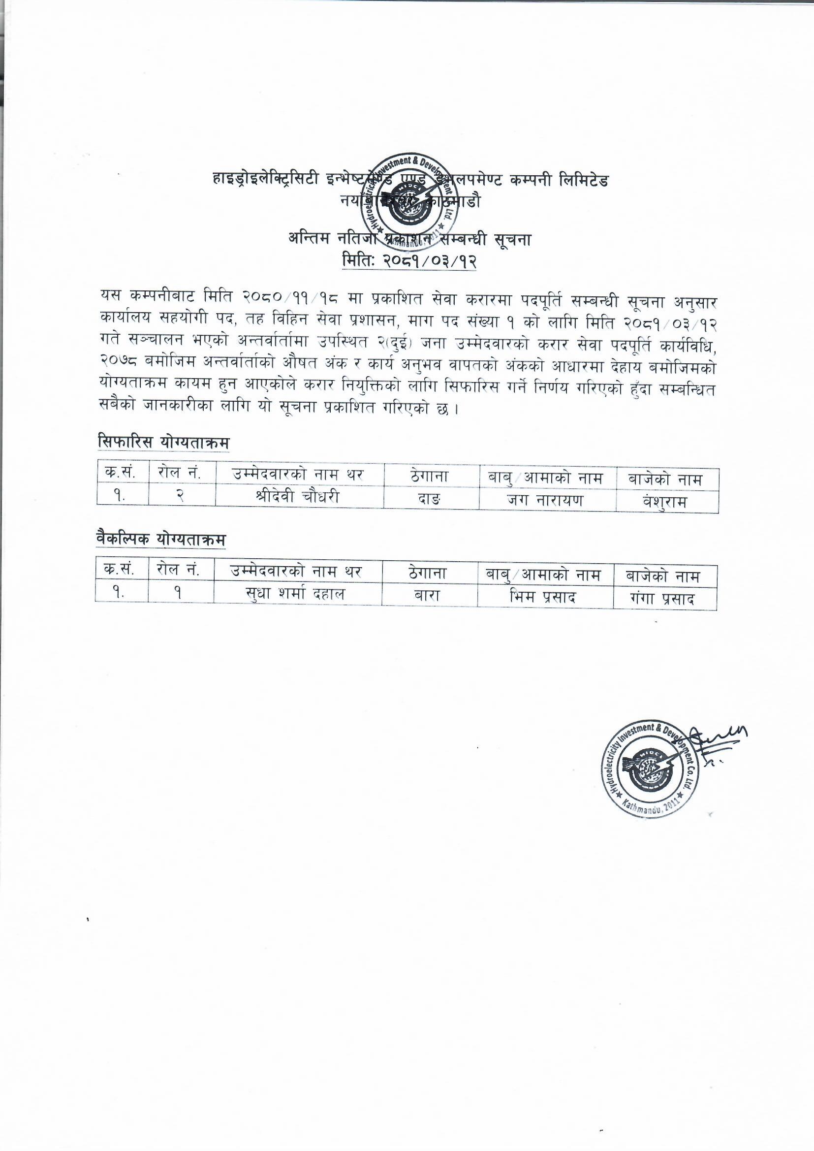 - तह -११, प्रमुख कार्यकारी अधिकृत (हाइड्रोपावर)का उम्मेदवारको नामावली प्रकासन गरिएको सूचना
