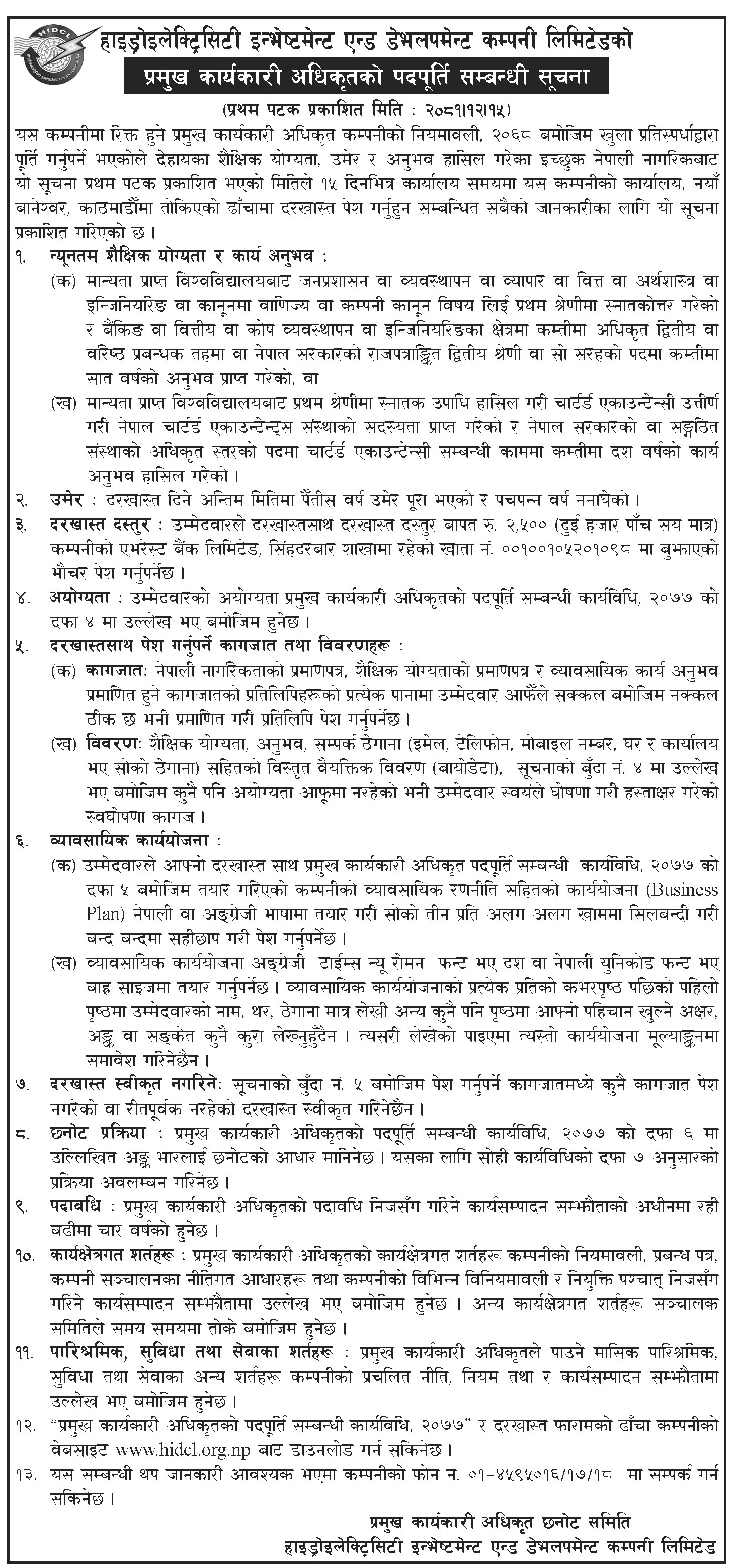 - प्रमुख कार्यकारी अधिकृतको पदपूर्ती सम्बन्धी सूचना