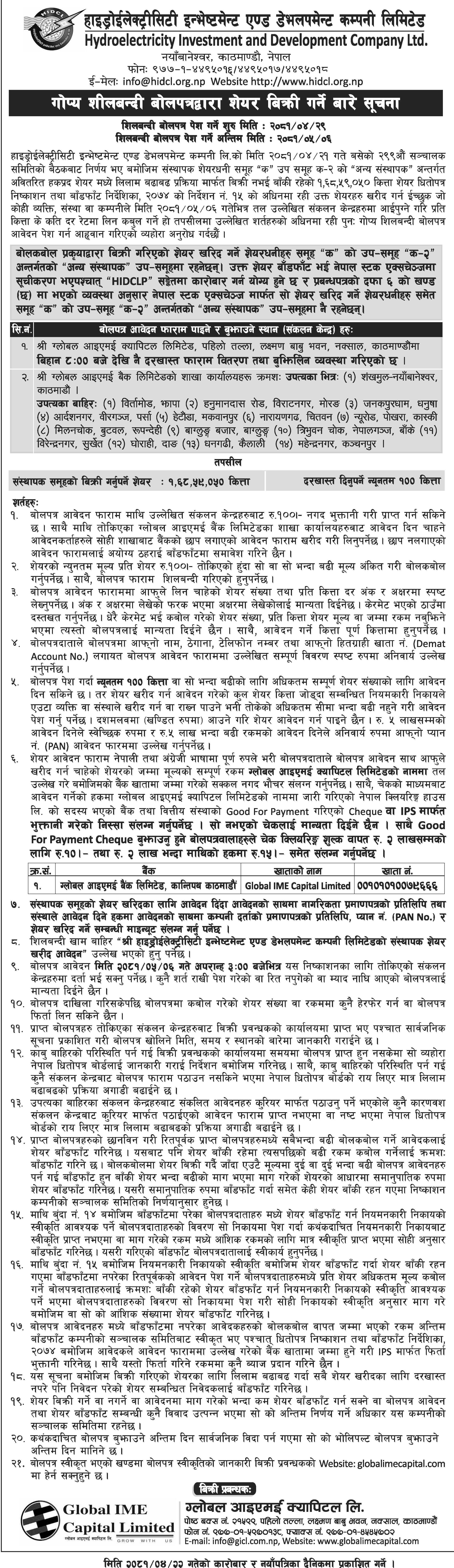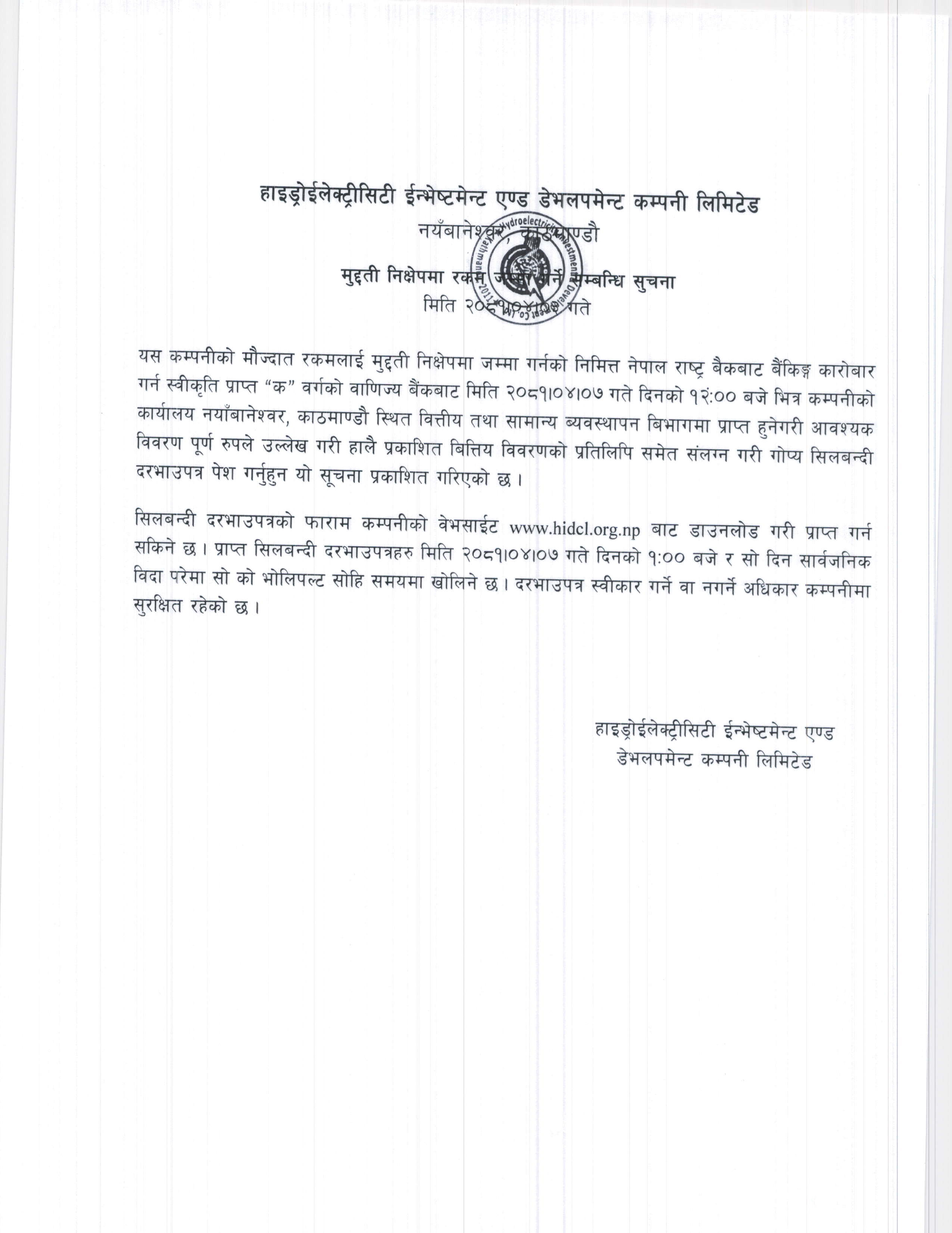 - शिलबन्दी बोलपत्रद्वारा शेयर बिक्री गर्ने बारे सूचना