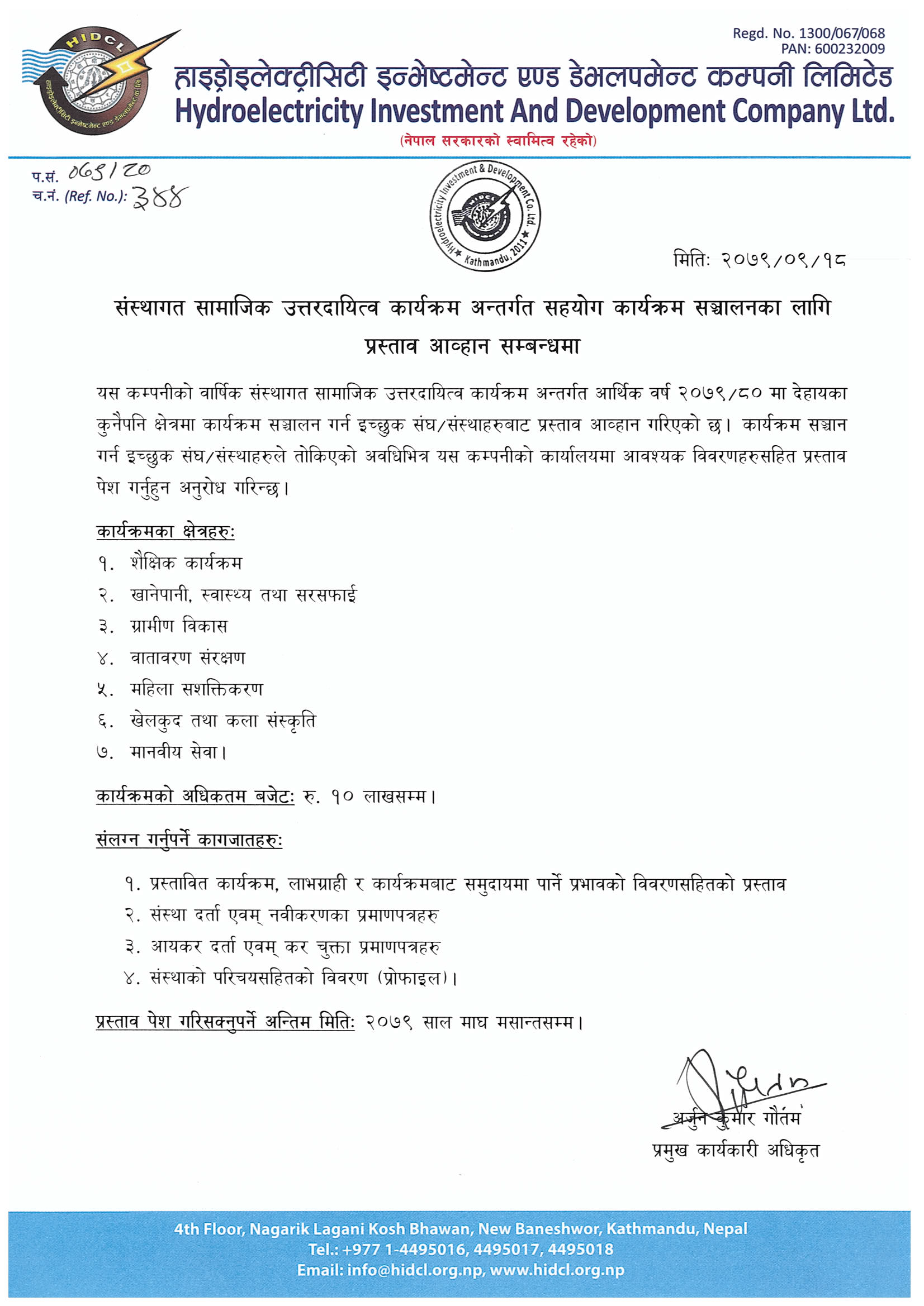 - संस्थागत सामाजिक उत्तरदायित्व कार्यक्रम अन्तर्गत सहयोग कार्यक्रम सञ्चालनका लागी प्रस्ताव आव्हान सम्बन्धमा