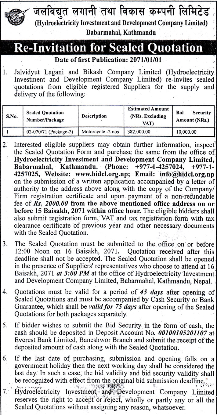 - Re-Invitation for Sealed Quotation for supply and delivery of Motorcycle (Package-2: 070/71)