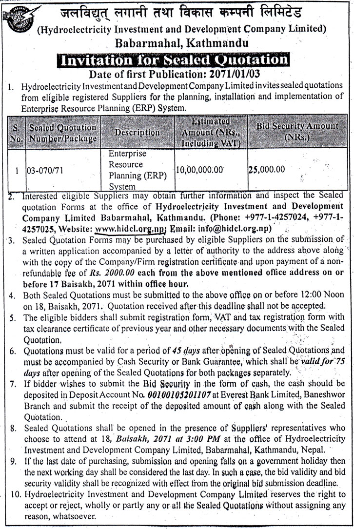 - Invitation for Sealed Quotation for planning, installation and implementation of Enterprise Resource Planning (ERP) System