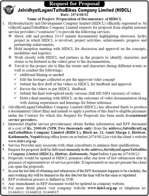 - Request for Proposal for Preparation of Documentary of HIDCL