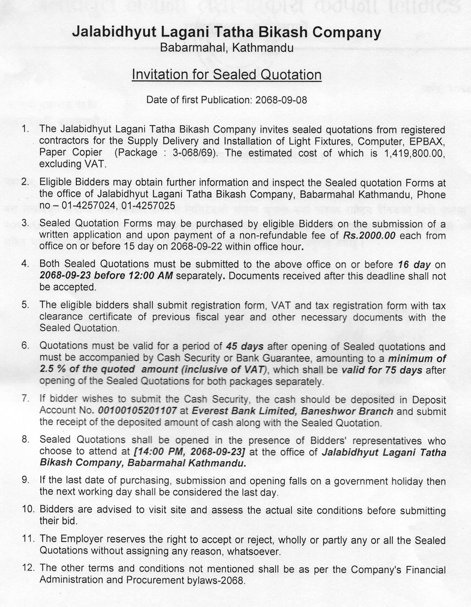 - Invitation for Sealed Quotation for the Supply Delivery and Installation of Light Fixtures, Computer, EPBAX, Paper Copier (Package: 3-068/69)