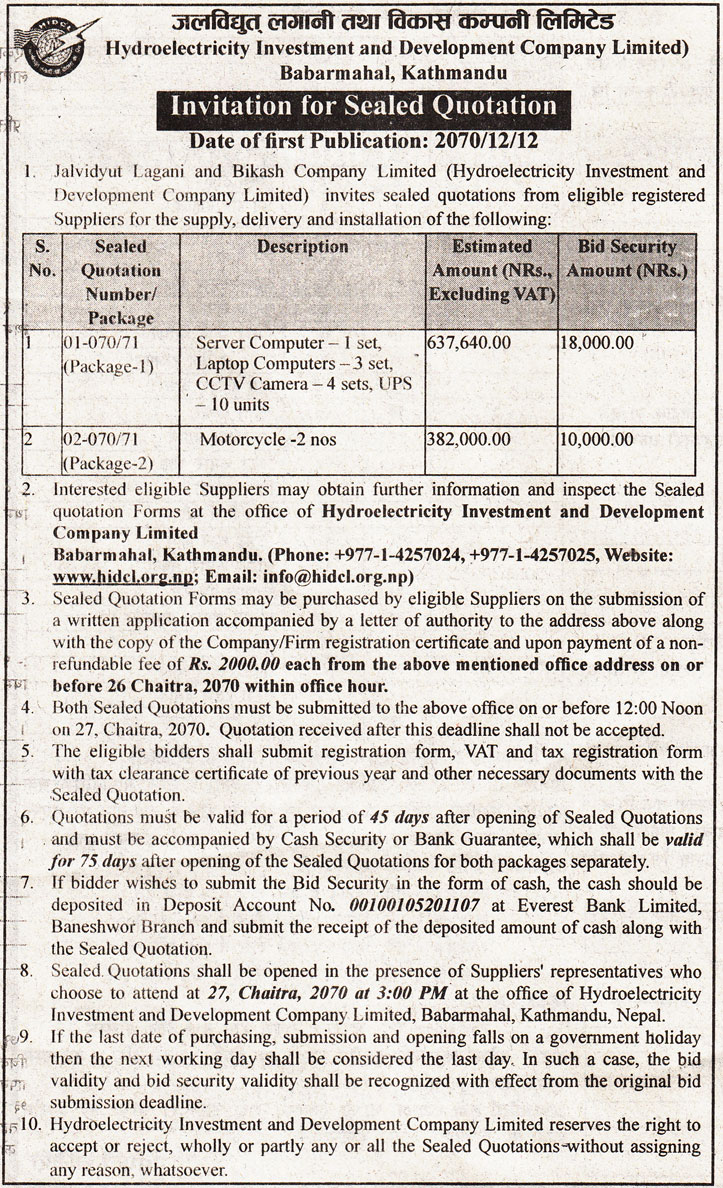 - Invitation for Sealed Quotation for supply, delivery and installation of Server Computer, Laptop Computer, CCTV Camera and UPS (Package-1:070/71) and Motorcycle (Package-2: 070/71)