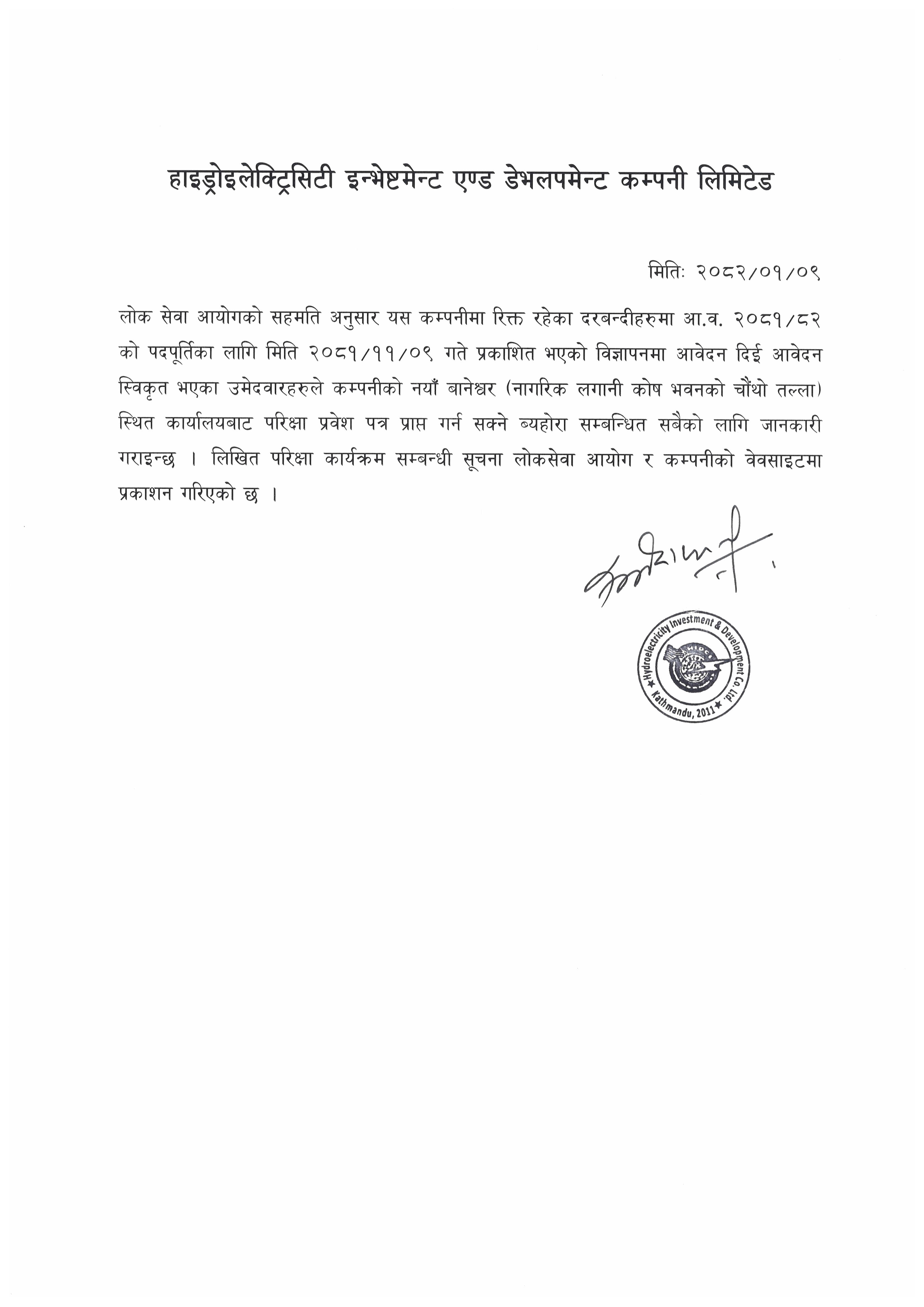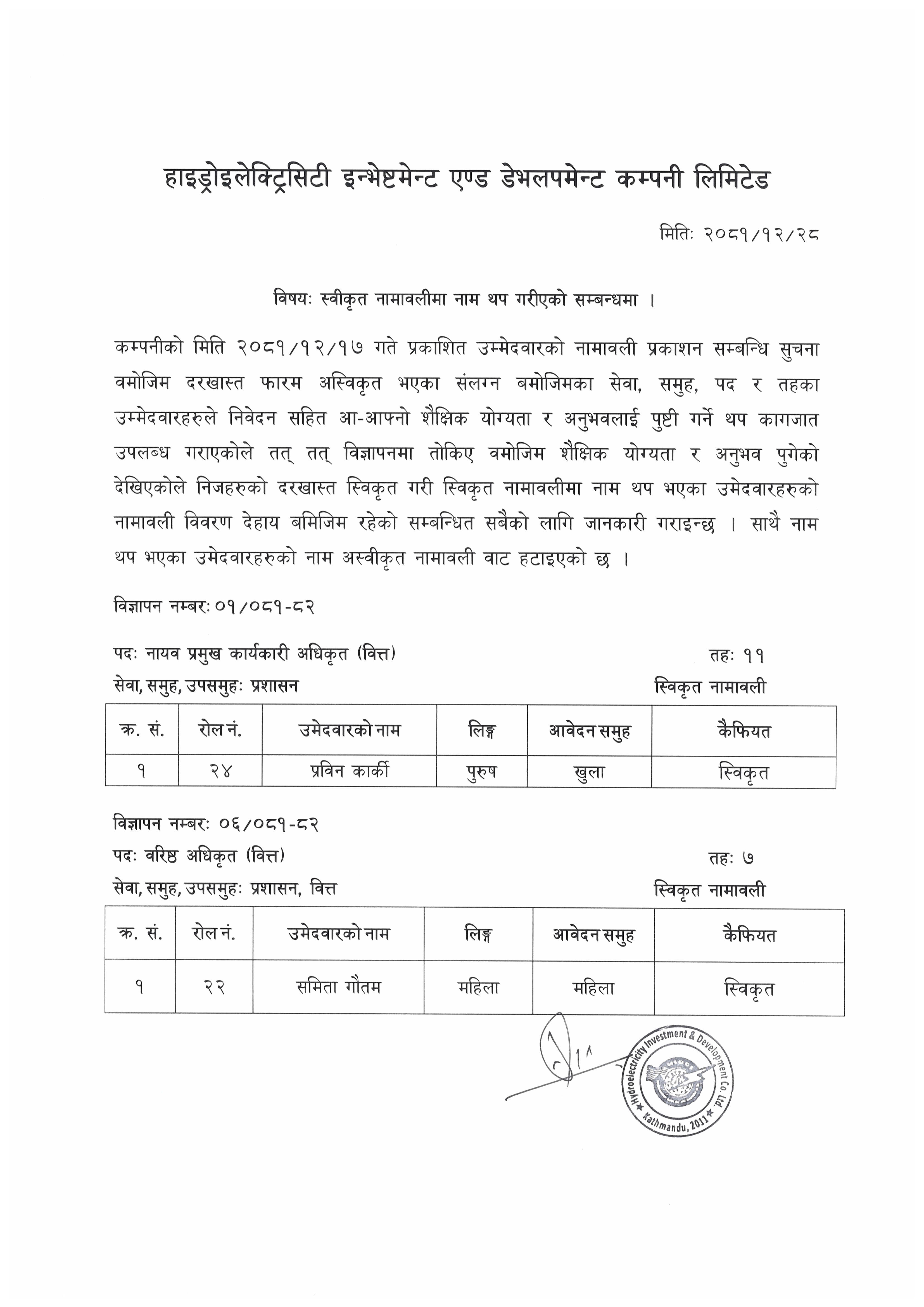 - तह -१०, प्रमुख प्रबन्धक (हाइड्रोपावर)का उम्मेदवारको नामावली प्रकासन गरिएको सूचना