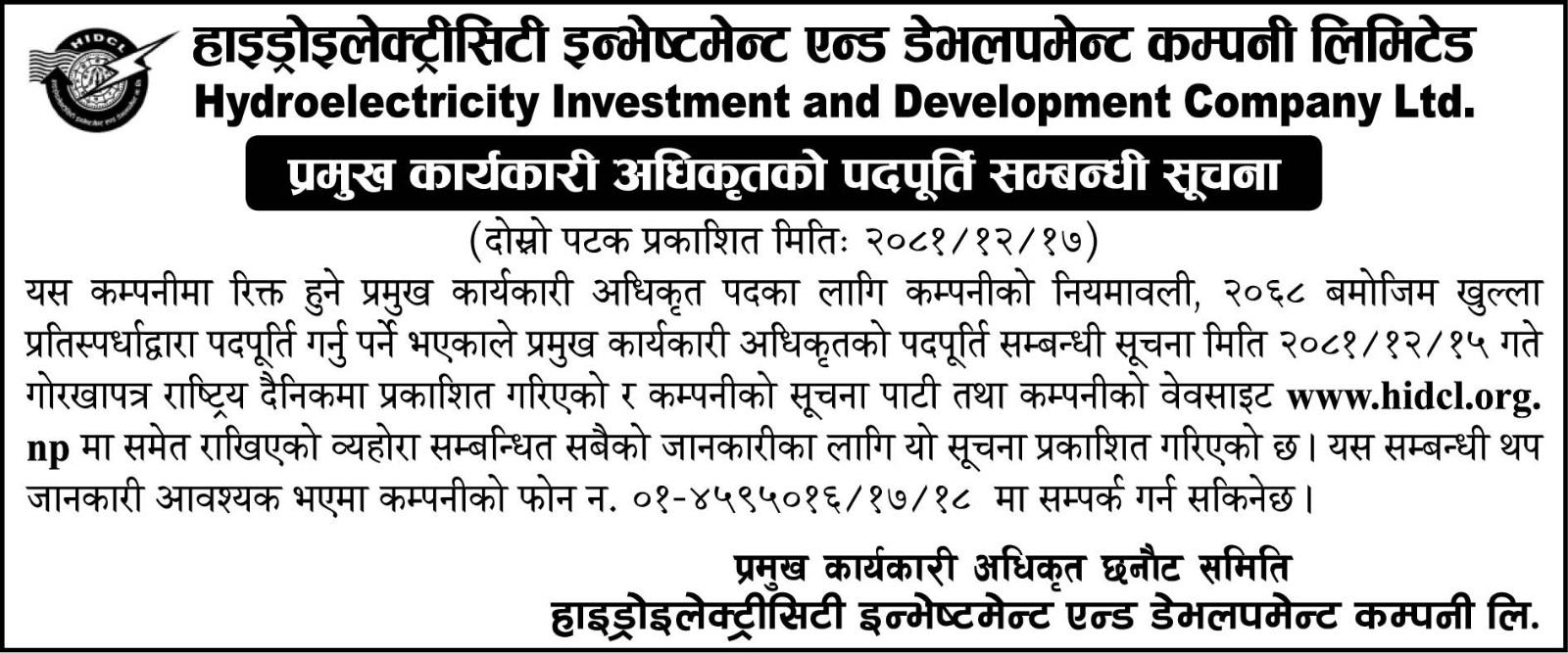 - प्रमुख कार्यकारी अधिकृतको पदपूर्ती सम्बन्धी सूचना