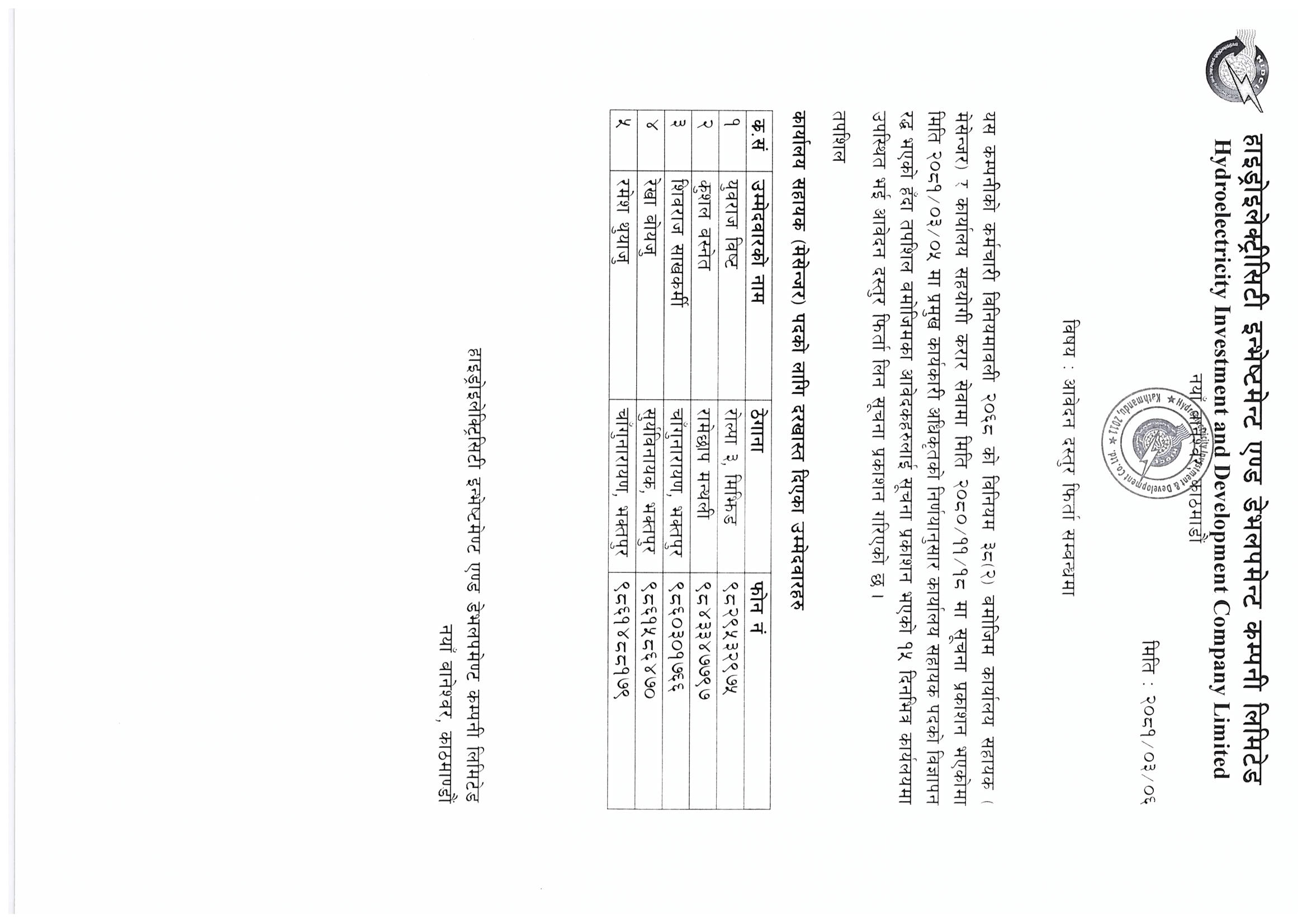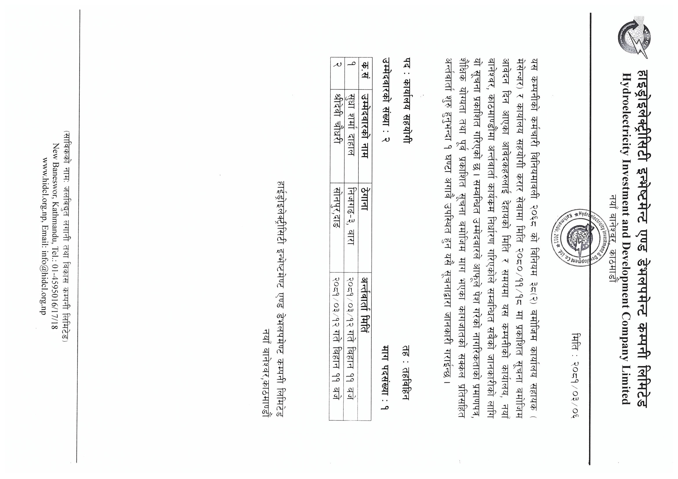 - तह -८, प्रबन्धक (हाइड्रोपावर)का उम्मेदवारको नामावली प्रकासन गरिएको सूचना