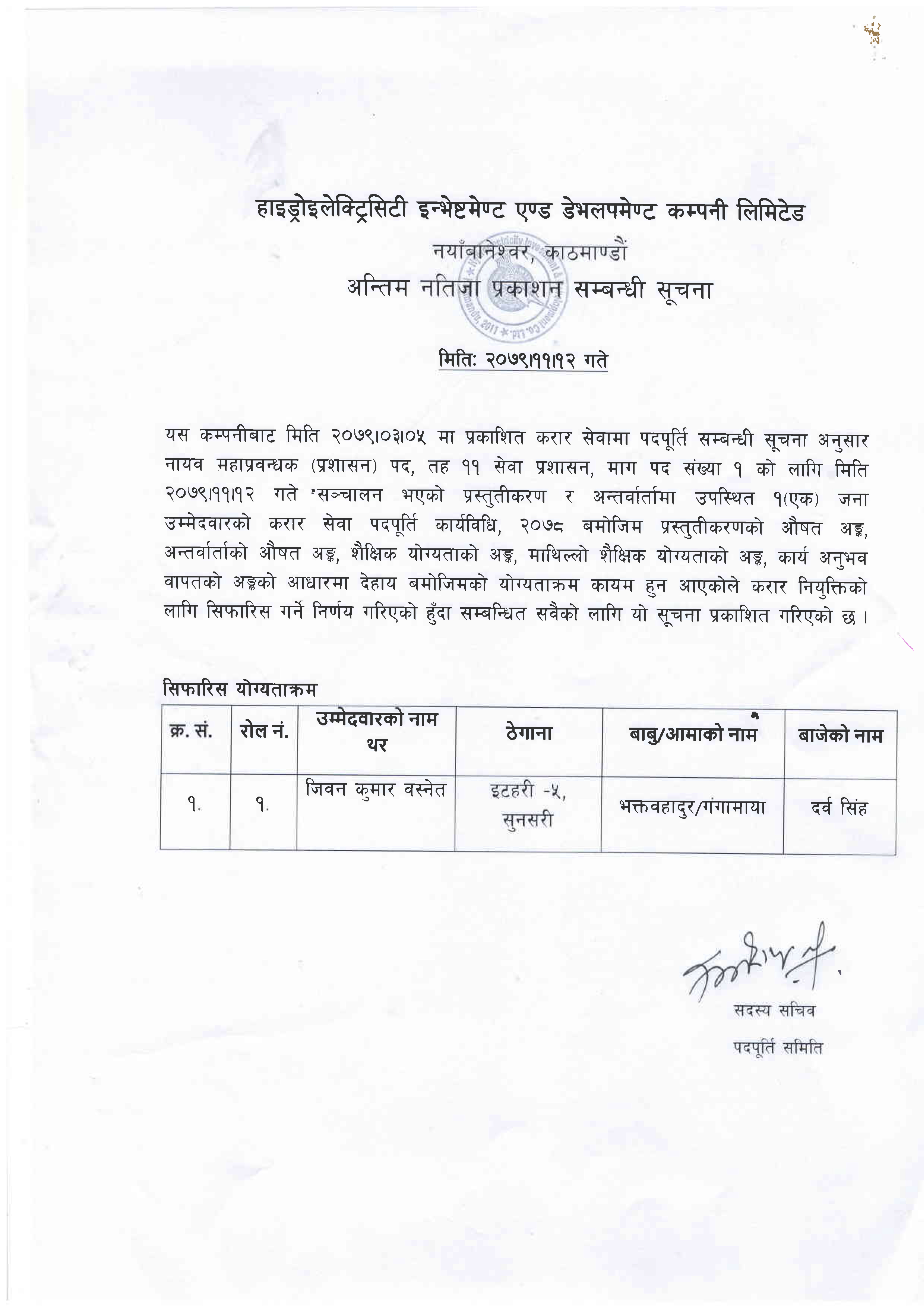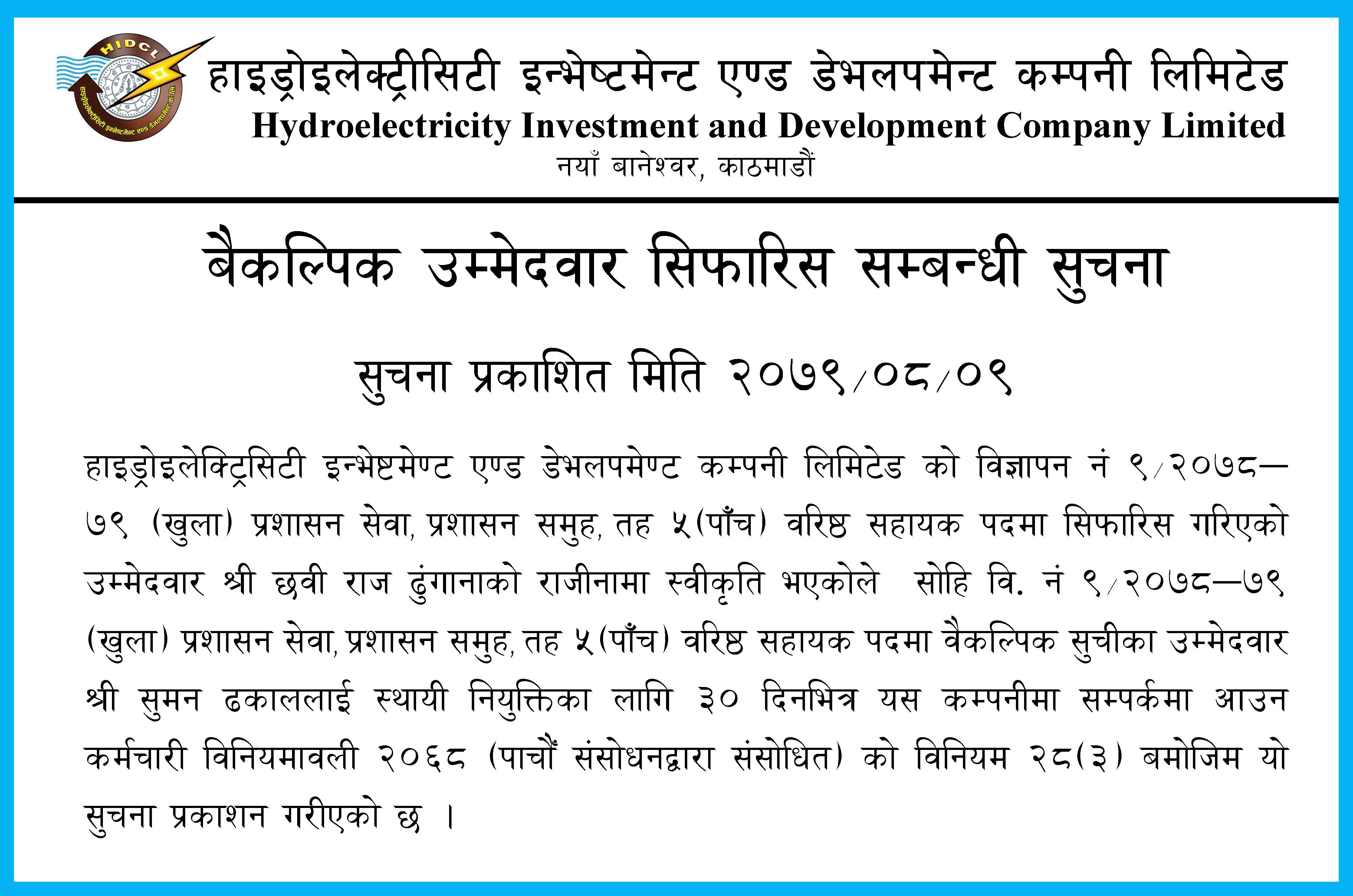 - हाइड्रोइलेक्ट्रिसिटी इन्भेष्टमेन्ट एण्ड डेभलपमेन्ट कम्पनी लिमिटेडको लिखित परीक्षाको नतिजा र अन्तर्वार्ता सम्बन्धी सूचना