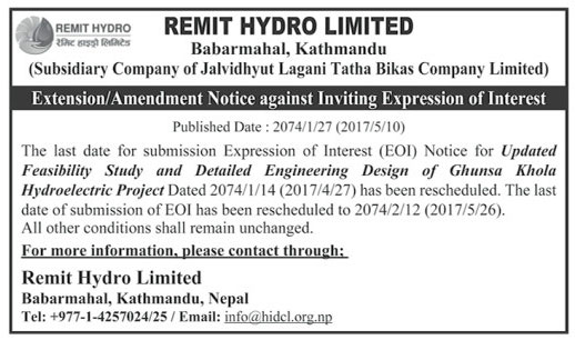 - Remit Hydro - Extension/Amendment Notice against Inviting Expression of Interest for Updated Feasibility Study and Detailed Engineering Design of Ghunsa Khola Hydroelectric Project