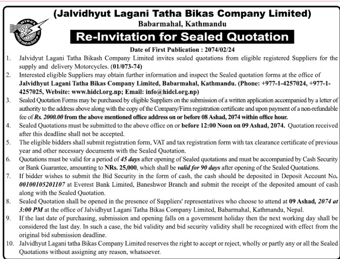 - Re-Invitation for Sealed Quotation for supply and delivery of Motorcycle (Package-2: 070/71)